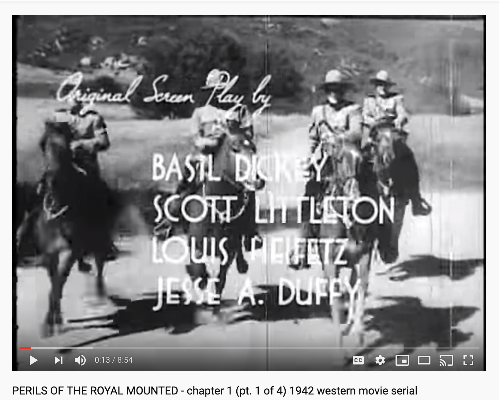 Scott Littleton, after completing The Barcelona, went on to become a writer/director in Hollywood from the dawn of “The Talkies” to the time of TVs incursion on the entertainment scene. Source: screen grab from YouTube video: Chapter 1 of PERILS OF THE ROYAL MOUNTED, a western movie serial made by Columbia in 1942 starring Robert Kellard.