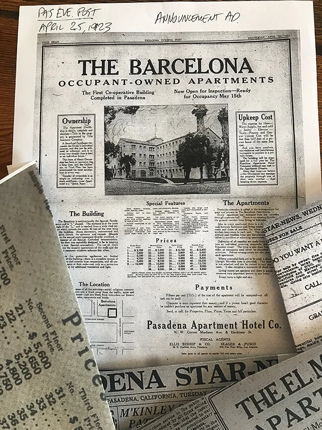 From 1922 to 1924, The Littleton Company advertised in the Pasadena Star-News and Pasadena Evening Post, as well as the Los Angeles Times. The Littleton Company became known for quality and innovation. The Barcelona was their biggest project, before closing their doors midway into supervising the construction of The Pasadena Playhouse, in 1924. Source: Pasadena Public Library microfilms of Star-News and Evening Post; Newspapers.com for LA Times ads.
